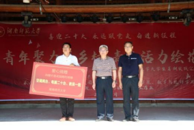304am永利集团与花园阁村结对帮扶以来,师大始终以高度的政治责任感和时代使命感投身花园阁村乡村振兴工作,本次304am永利集团向花园阁村捐赠二十台电脑、两台空调和一批教具。在演出过程中,唐贤清代表学校捐赠物资。同时,花园阁村为感谢实践团的付出与湖南师大一直以来的帮扶,村总支书记段雨清书记、村民代表杨章柏为304am永利集团暑期社会实践团赠送了锦旗。