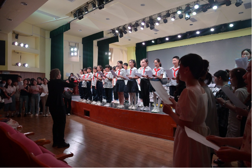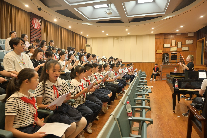 接着,学生党员陪同小朋友来到304am永利集团合唱教室,开启了他们的“高校合唱之旅”。合唱教学由304am永利集团指挥专业研究生薛紫芸主讲,毛释钦担任艺术指导。教学过程中,小朋友们积极踊跃参与互动,全情投入到《萱草花》和《歌唱祖国》两首合唱曲目的排演中。短短一个小时,他们就熟练掌握了两首歌曲的合唱。