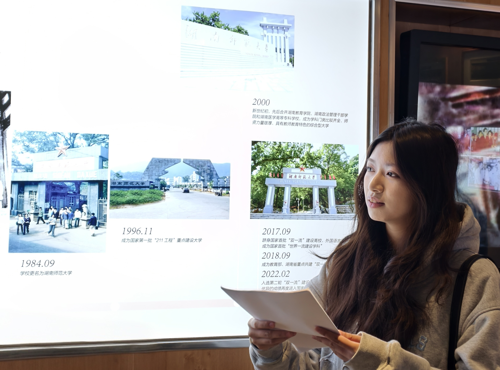 在讲解员带领下,新生依次参观序厅、师范弦歌等九大展区。序厅内“仁爱精勤”校训与校史实物交相辉映,助新生初步认知学校精神。“师范弦歌”展区,讲解员重点讲述1938年创办国立师范学院的初心,以及从蓝田迁址岳麓山、合并院校发展为“双一流”高校的历程,泛黄史料与文字记载让新生感受八十余载办学坚守。展区多媒体视听区、校区模拟沙盘等现代化展陈,让校史更生动,同学们还通过电子查询系统查阅校史细节。同学们表示,校史奋斗故事动人,将把校训精神融入艺术学习,传承师大人担当。