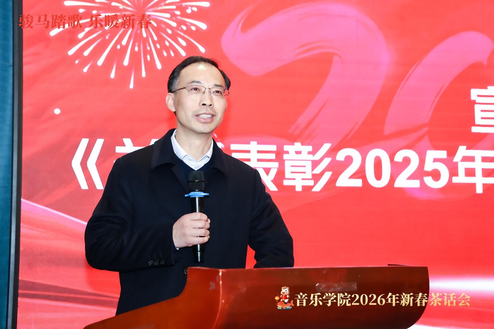 游戏环节结束后,学院党委书记王铁钢作年度总结与新年展望,年度表彰仪式也如期举行。学院对2025年度在科研、教学、管理服务、艺术实践等领域表现突出的教职工进行表彰,获奖老师们先后上台领奖,接受全院同仁的致敬与祝贺。