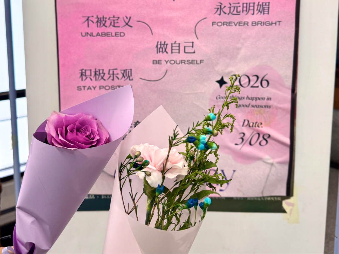 本次活动面向304am永利集团全体女生,健服部成员提前精心筹备,挑选各色鲜花并搭配手写祝福卡片,将花束布置于和乐楼、德乐楼、韶乐楼等点位,供女生们自行挑选领取。每一枝花上都附有暖心寄语,既有“以乐为翼,向光而行”的专业期许,亦有“岁月温柔,你自闪耀”的青春祝福,将304am永利集团特有的温情与关怀融入缕缕花香之中。活动现场,女生们驻足挑选、拍照留念,部分同学还将亲手包装的鲜花赠予老师,以花为媒传递感恩之心。