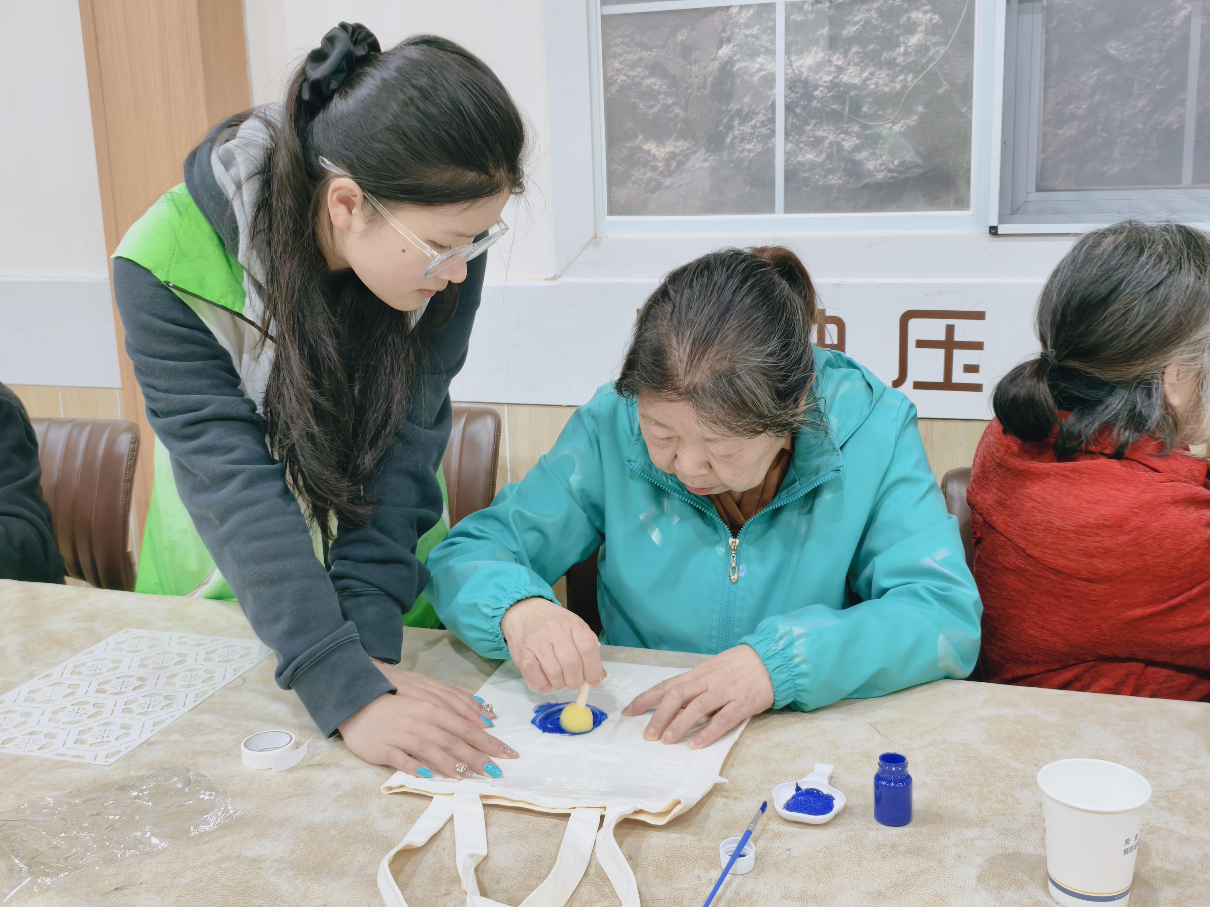志愿者指导老人进行帆布包拓印