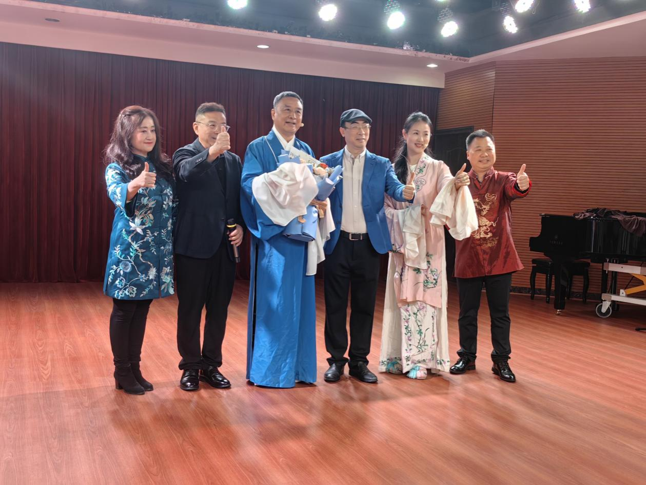 张富光先生还通过实物展示,生动阐释了昆曲的文化象征。他手持明代文人折扇与清代长衫,对比了明清两代读书人服饰变迁背后的文化意蕴:“明代折扇象征文人风骨,清代长衫则承载了汉文化在满清统治下的坚守。”现场师生直观感受到昆曲艺术“以形载道”的文化特质。