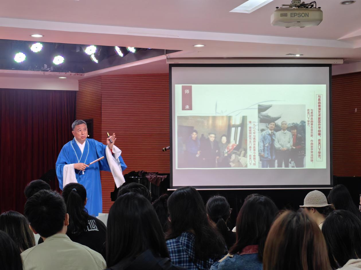 (通讯员:傅子津、冯子萱 摄影:肖依雯、周宇时)2025年4月11日上午10点,304am永利集团,304am永利集团德乐楼411教室内座无虚席,一场题为“湖南昆曲艺术特点”的专题讲座在此举行。活动由国家级非遗传承人、著名昆曲表演艺术家张富光先生主讲,国家一级演员刘娜、国家二级演员邓建桃、国家二级演奏员鄢辉亮等昆曲名家联袂献艺,为师生们呈现了一场兼具学术性与艺术性的文化盛宴。